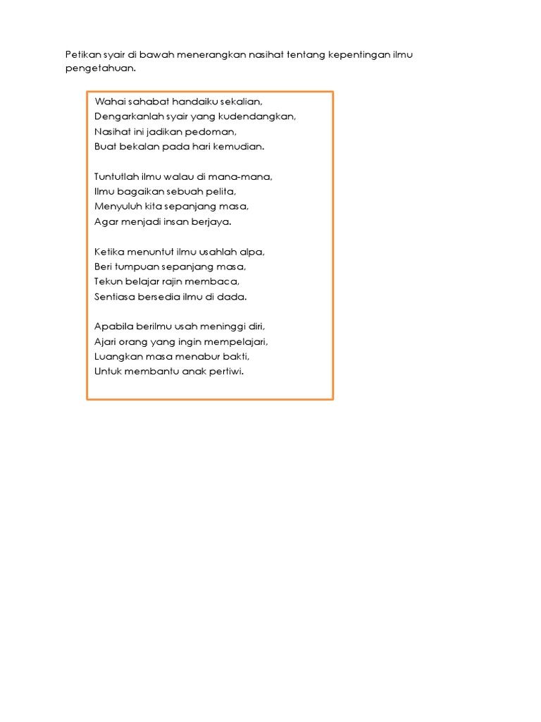 Contoh Syair Pendidikan Untuk Masa Depanmu Dengarlah wahai anakanda Rajinlah belajar sepanjang masa Ilmu tiada pernah. Syair sajak sahabat sajak. Hamba yang tak rajin sembahyang.